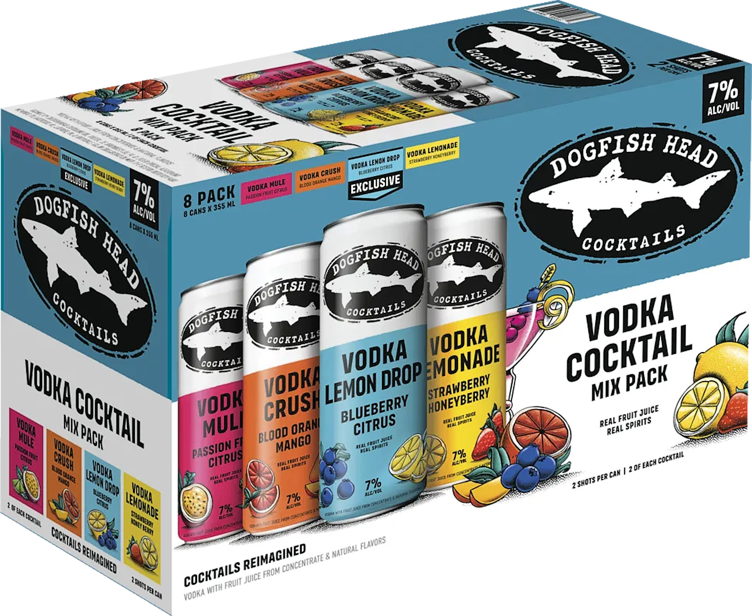 "A variety pack containing two cans each of Dogfish Head Blueberry Citrus Vodka Lemon Drop, Passionfruit Citrus Vodka Mule, Blood Orange and Mango Vodka Crush and Strawberry and Honeyberry Vodka Lemonade."