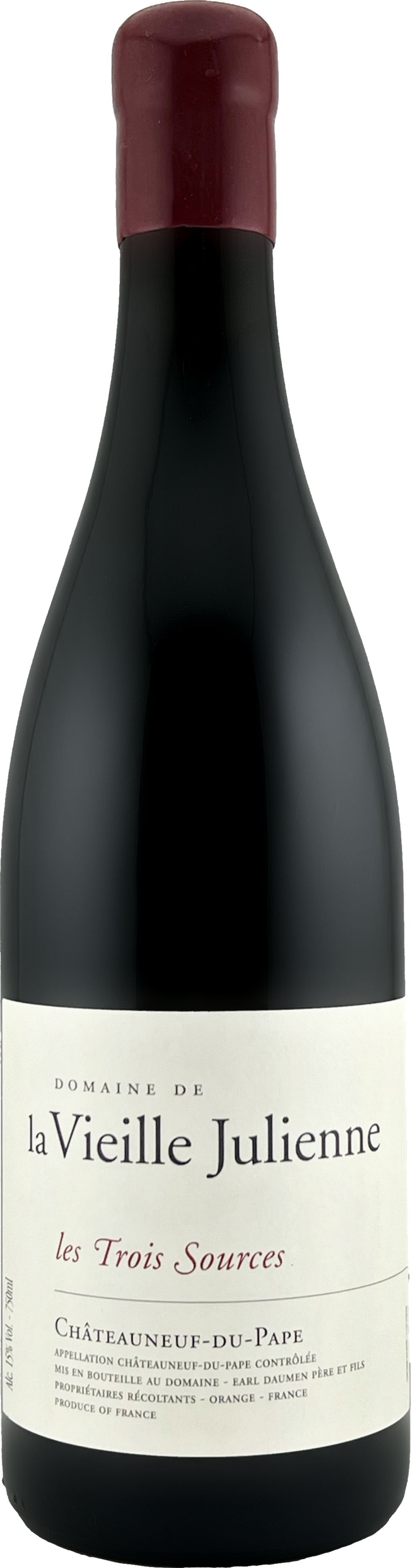 "More cassis, morello cherry, Asian spice, and a beautiful sense of minerality and loamy earth emerge from the 2019 Châteauneuf Du Pape Les Trois Sources, a full-bodied, concentrated blend of 60% Grenache, 15% each of Cinsault and Syrah, and the balance Mourvèdre...this incredibly concentrated, textured wine has perfect balance, building tannins, and a great finish. Give this beauty another 4-5 years in the cellar and drink it over the following two decades or more." 96+ Points, Jeb Dunnuck